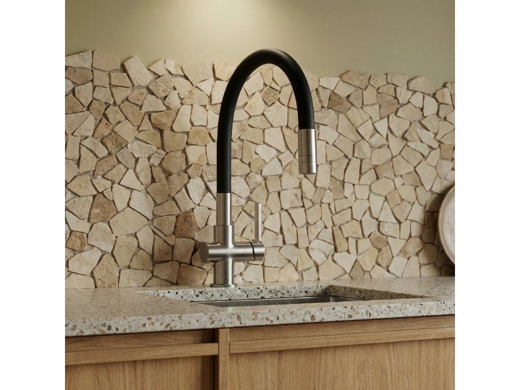 Kombinace kartáčovaného niklu a černé matné výlevky. Elastická U-výlevka usnadní plnění vysokých nádob i mytí dřezu.
