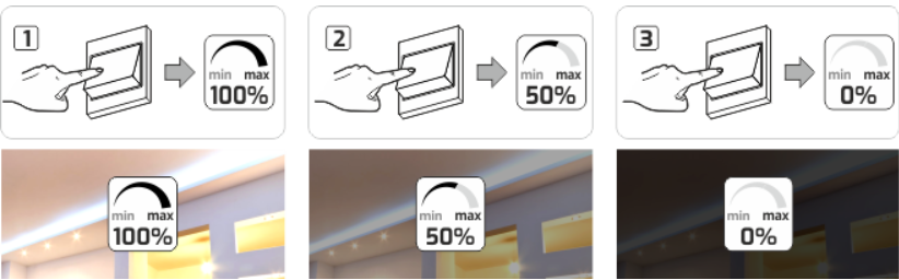 Sada bezdrátového klávesového vypínače a RF ovladače pro jednobarevné (MONO) LED pásky na 12V DC nebo 24V DC. Bezdrátová komunikace má dosah až 30 m (RF 2,4 GHz) a systém nabízí 3stupňovou regulaci intenzity světla. Zvládne zatížení až 12A (max. 144W při 12V / 288W při 24V). Umožňuje připojit dva vypínače k jednomu ovladači.