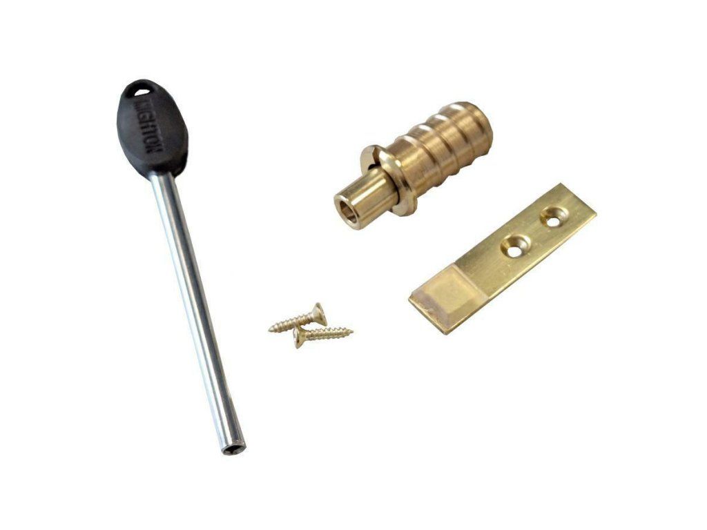 Blokada z kluczem do okien podnoszonych (przesuwnych w pionie) - Wykończenie: mosiądzowane - Wkręty do montażu w zestawie
