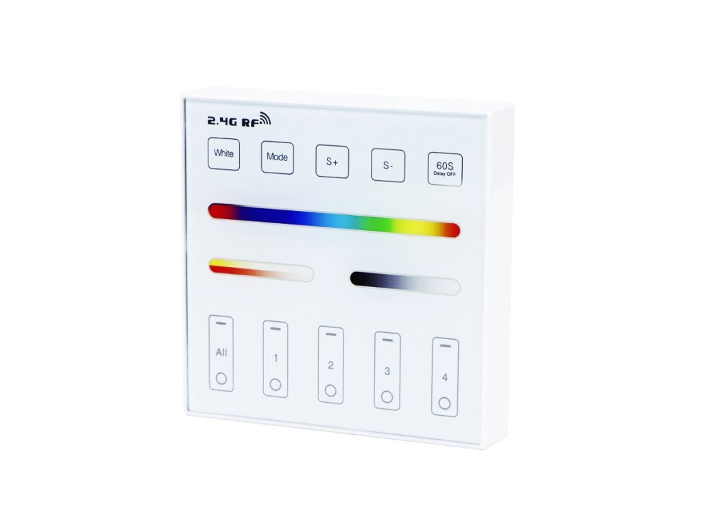 Dotykový nástěnný RF panel MULTI 5v1 (4 zóny) je bezdrátové ovládání LED osvětlení pro více typů světel v jednom systému. Umožňuje řídit až 5 typů LED osvětlení: Mono, Bicolor (CCT), RGB, RGBW a RGB + Bicolor (CCT) – a to ve 4 samostatných zónách.