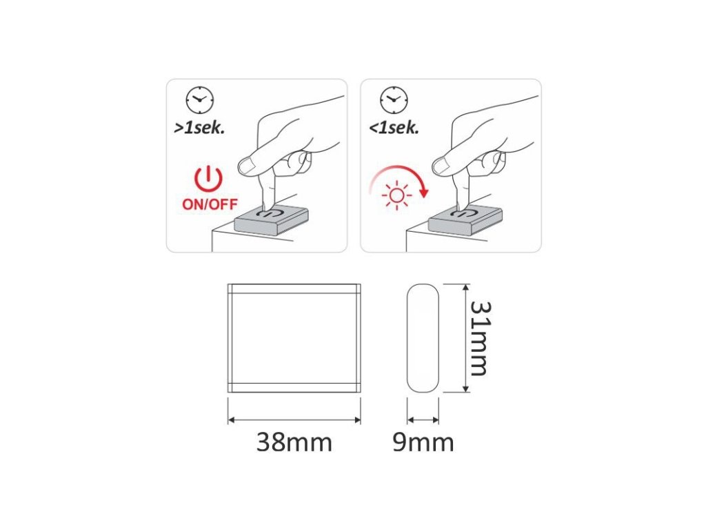 Dotykový vypínač TOUCH se stmívačem pro LED osvětlení 12V DC / 24V DC. Krátký dotyk po celé ploše světlo zapne/vypne, dlouhý dotyk aktivuje stmívání. Max. zatížení 36W (12V) / 72W (24V), krytí IP20, rozměr 38 × 31 × 9 mm, kabeláž 2× 1 m (konektor samec + konektor samice).