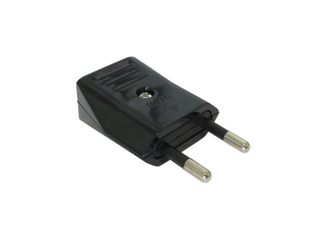 Wtyczka elektryczna - Materiał wykonania: polipropylen - Kolor: czarna - Maksymalne napięcie: 250V - Maksymalne natężenie prądu: 10A - Bez uziemienia - Średnica jednego bolca: 4 mm