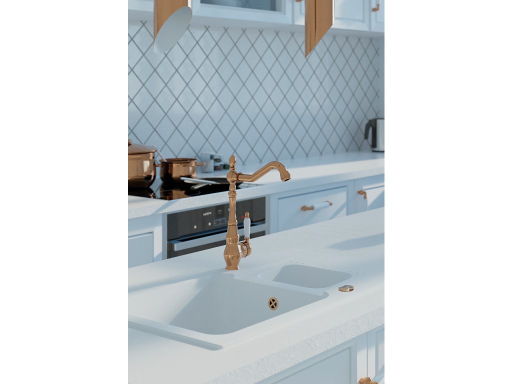Evora by Laveo je kompozice elegantních, neobvyklých tvarů a precizního zpracování. Je lahůdkou pro milovníky retro stylu v interiéru. Evora se ve stylizované kuchyni bude vyjímat jako klasické perly vedle malých černých šatů. Je k dispozici ve čtyřech barvách: chrom, starožitná mosaz, černá a stále módní měď. Jednopáková baterie ve tvaru písmene L s otočnou výlevkou umožňuje pohodlné mytí i velkého nádobí a zajišťuje pohodlné používání při každodenní kuchyňské práci. Je vyrobena z vysoce kvalitní mosazi MO54, dodává se se servisem na místě a zárukou 8 let.