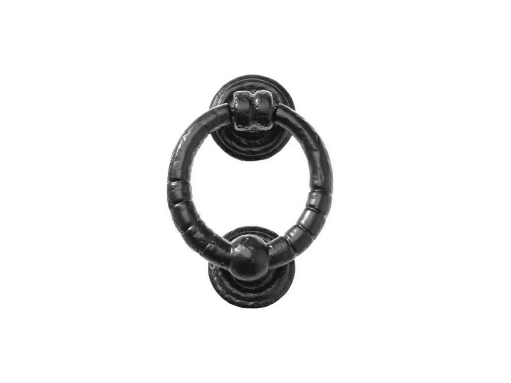 Kołatka rustykalna okrągła - Materiał: stal - Wykończeni: czarna - Średnica zewnętrzna pierścienia kołatki: 120mm - Średnica górnej i dolnej rozety: 65mm - Głębokość: 57mm - Mocowanie do drzwi za pomocą śrub gwintowanych o dł. 70mm (dostarczane w komplecie)