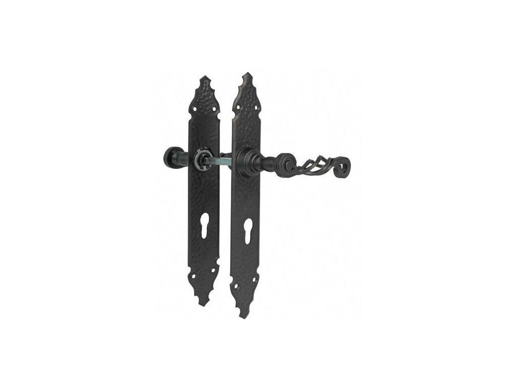 Komplet pięknych klamek w stylu retro, z długim szyldem, na wkładkę hiszpańskiej firmy AMIG, model 102PB - Rozstaw (odległość od osi klamki do osi obrotu wkładki): 72mm - Wykończenie: czarna matowa - Rozmiar szyldu: 280x44mm - Dostarczane ze śrubami do montażu - Trzpień: 8mm Rysunek Techniczny