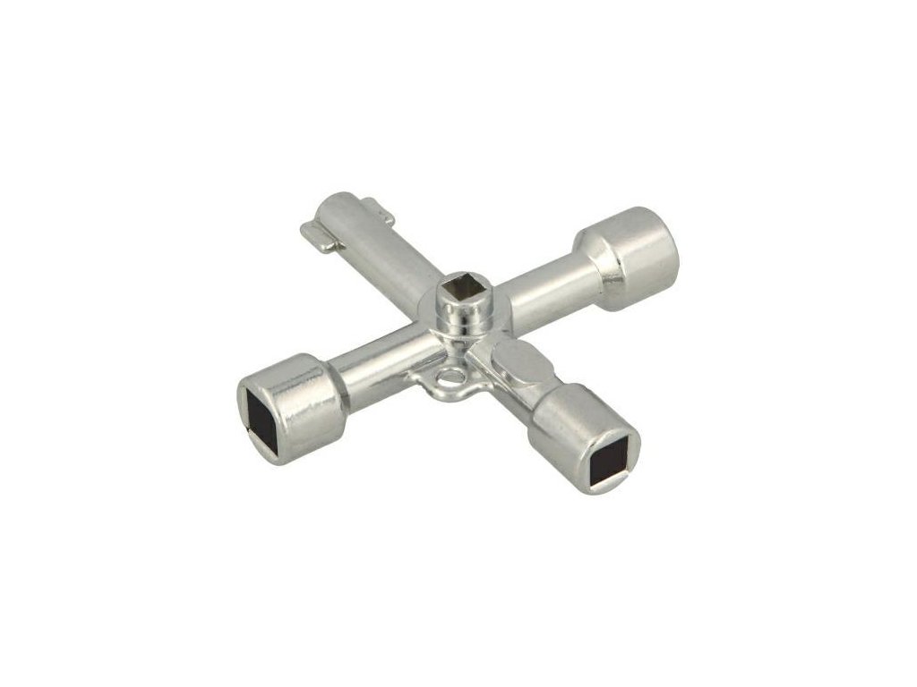 5-funkční křížový klíč mod. 107 - Materiál: ocel - Povrchová úprava: niklovaný - Rozměry: 72x72mm Pro otevírání skříněk na plyn, elektřinu, vodu atd. Multifunkční 4-směrný klíč z niklované oceli. Kompaktní velikost a křížový tvar usnadňující přepravu a použití. Technický výkresDoplňkové parametry