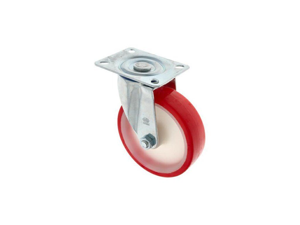 Kółko z poliuretanu, na obrotowej płytce, model 2540 hiszpańskiej firmy Amig - Średnica kółka: 100mm - Wysokość: 128mm - Szerokość: 30mm - Udźwig: do 120 kg - Wymiary płytki: 100x80 - Opona z czerwonego poliuretanu - Felga z białego nylonu - Metalowa płyta