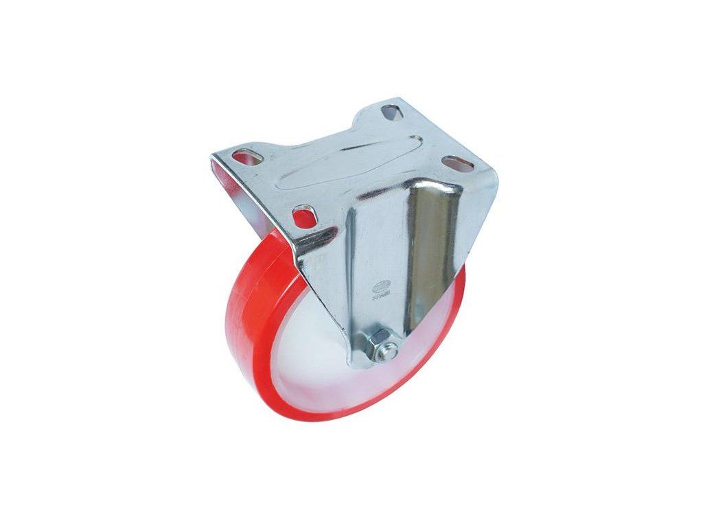 Kółko z poliuretanu, model 2542 hiszpańskiej firmy Amig - Średnica kółka: 125mm - Wysokość: 152mm - Szerokość: 35mm - Udźwig: do 170 kg - Wymiary podstawy: 100x84mm - Opona z czerwonego poliuretanu - Felga z białego nylonu - Metalowa płyta