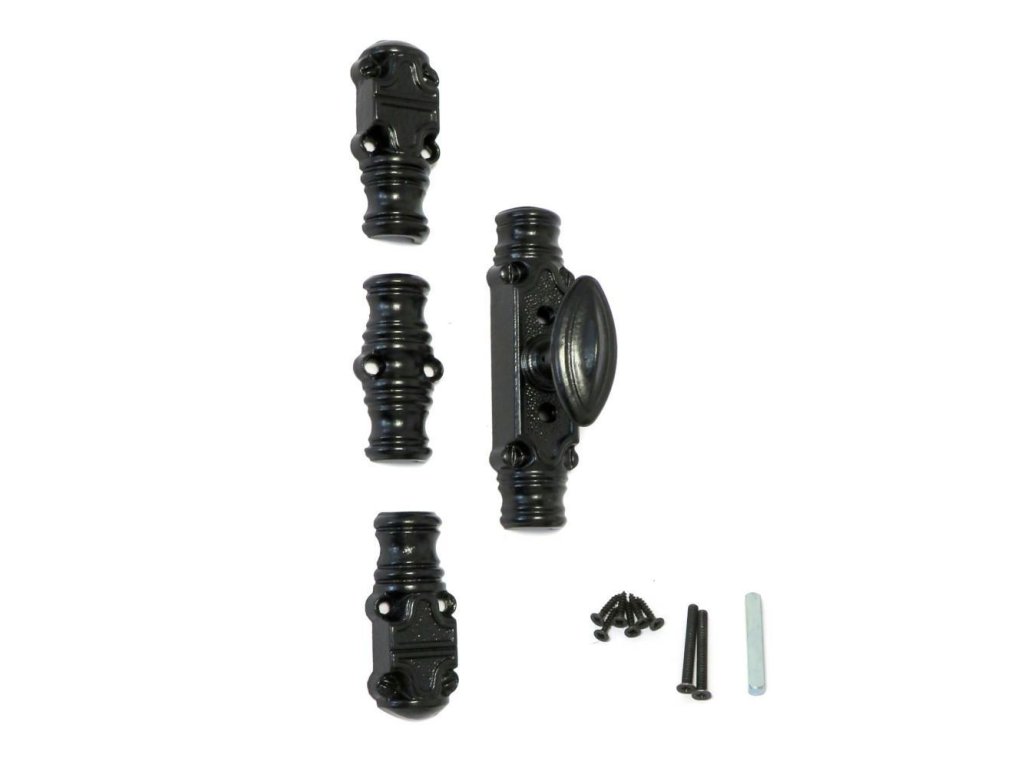 Okenní klika typu Cremone, pro francouzská okna, s vodítkem a protiplechy. - Materiál: litina - barva: černýDoplňkové parametry