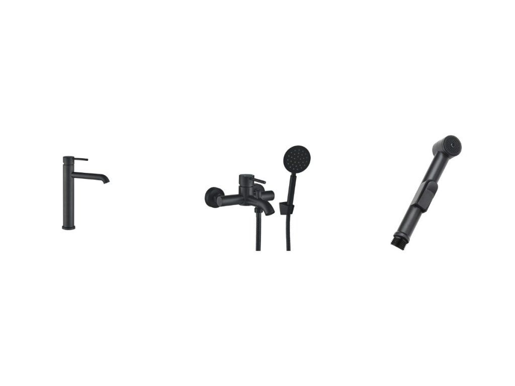 Designová koupelna v černé matné – sjednocený set NOIA od výrobce Laveo. Umyvadlová baterie, nástěnná vanová baterie se sprchovou sadou a sprchová hlavice Fen. Ušetříte 17 % oproti jednotlivému nákupu.