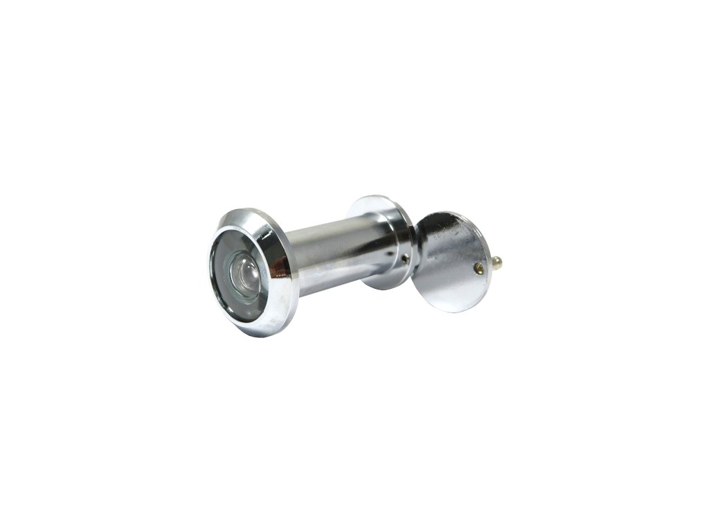 Mosazné kukátko s uzavírací krytkou Specifikace: - Průměr montážního otvoru: 14mm - Určeno pro dveře o tloušťce 35 - 55mm - Materiál: mosaz - Povrchová úprava: lesklý chrom - Velký pozorovací úhel (180°) - Čočka: sklo - certifikát požární odolnosti BS EN 1634 - 1Doplňkové parametry