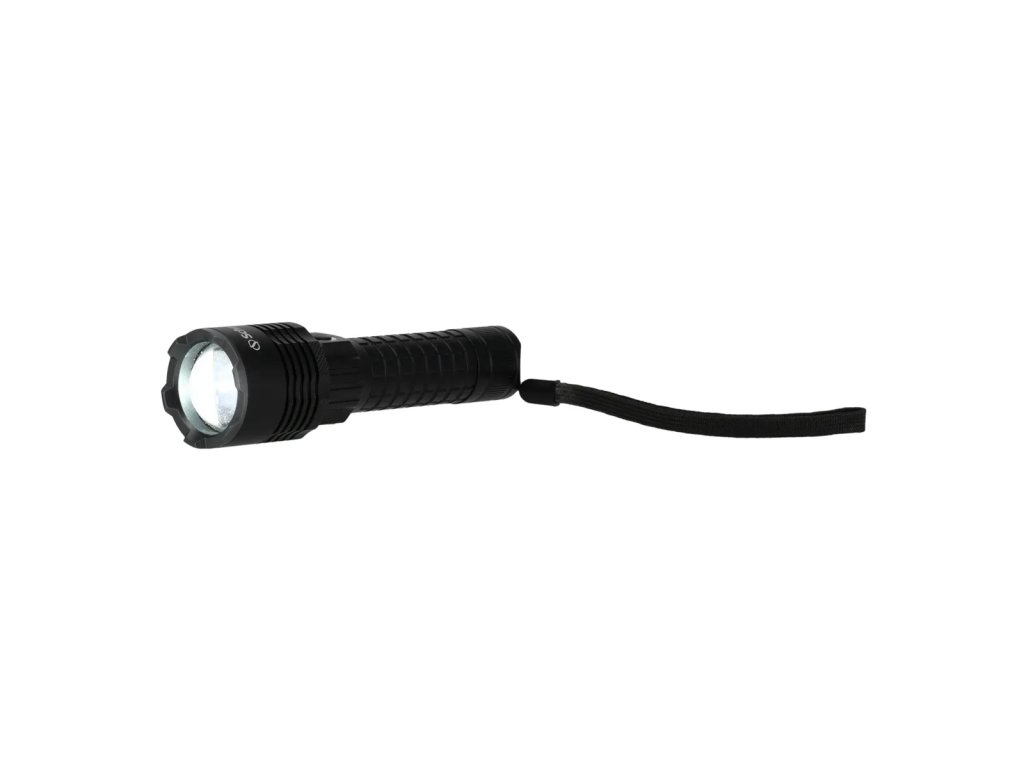 Akumulatorowa latarka ręczna wykonana z aluminium, posiadająca dwa tryby świecenia. Wyposażona w wygodny, funkcjonalny włącznik oraz cztery diody sygnalizujące poziom naładowania akumulatorów. Latarka posiada pasek do zawieszenia na dłoni.
