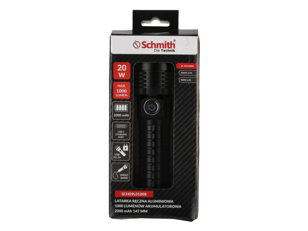 Akumulatorowa, aluminiowa latarka ręczna 1000lm 2000mAh Schmith