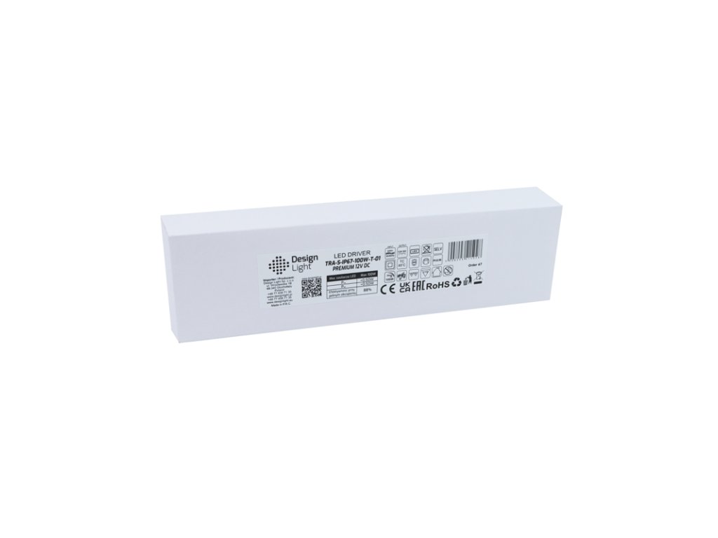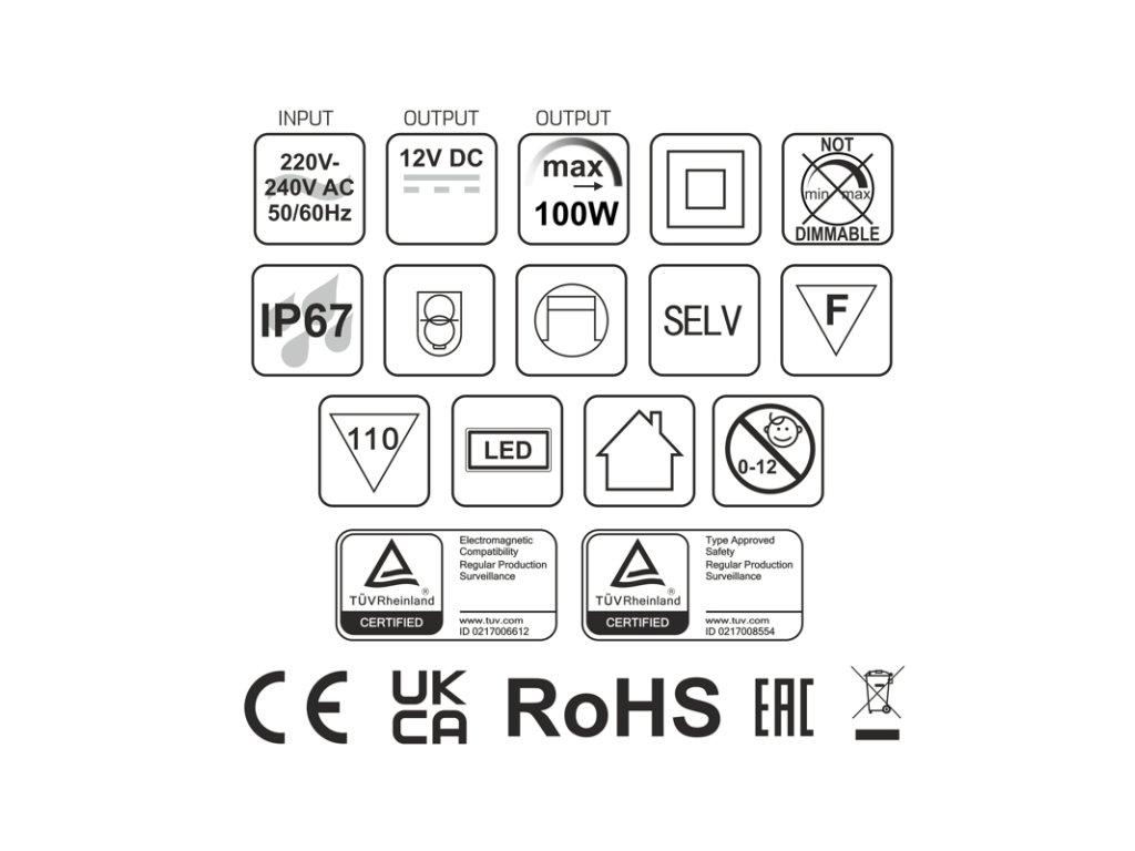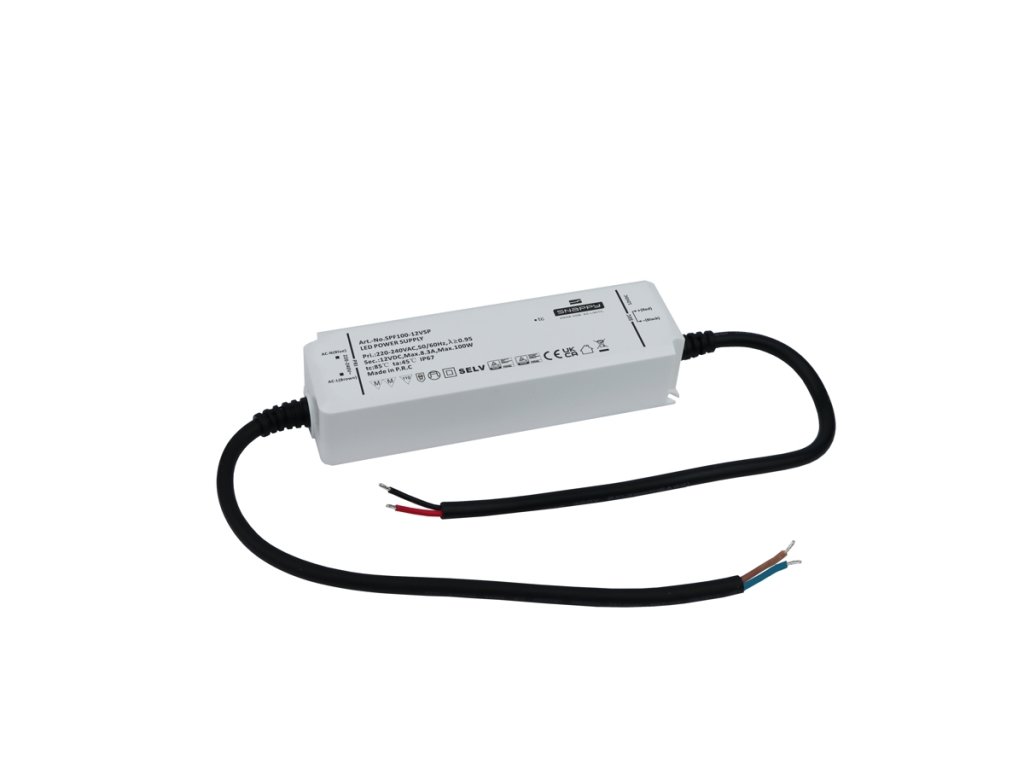 Profesionální LED napájecí zdroj se zvýšenou těsností IP67 pro vnitřní i venkovní použití. Je napájen střídavým napětím 220–240V~ 50/60Hz a snižuje výstupní napětí na 12V DC pro LED osvětlení s celkovým příkonem do 100 W.