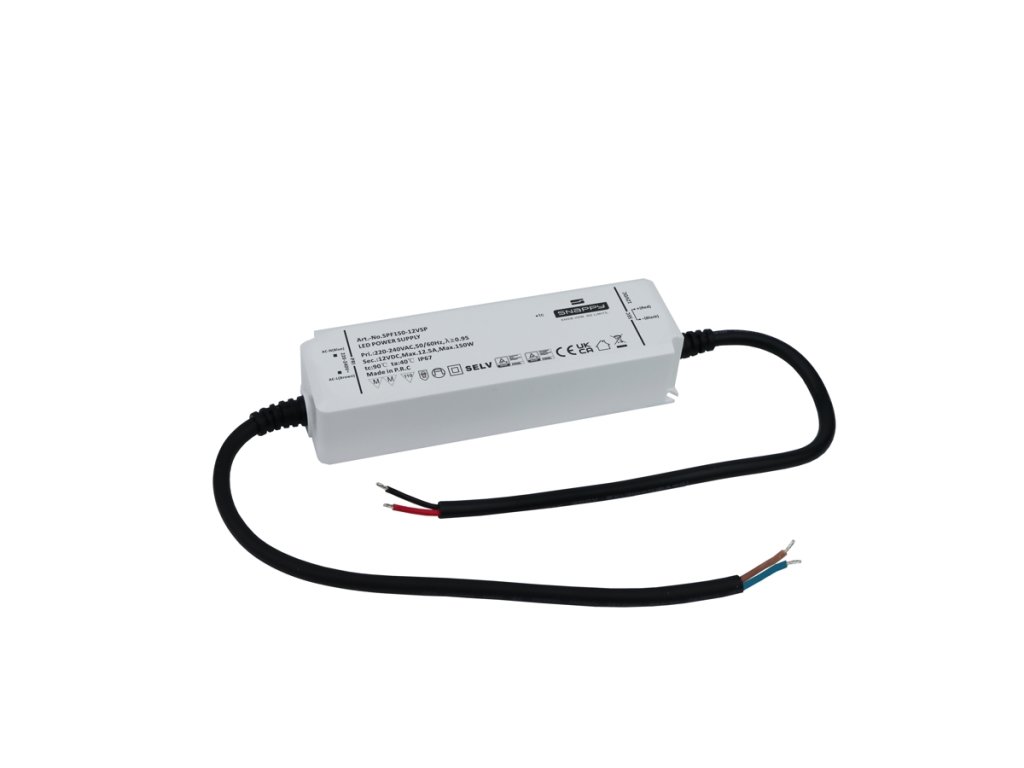 Profesionální LED napájecí zdroj s vyšší těsností IP67 pro použití v interiéru i exteriéru. Napájení 220–240V~ 50/60Hz, výstup 12V DC, pro LED osvětlení s celkovým příkonem do 150 W.