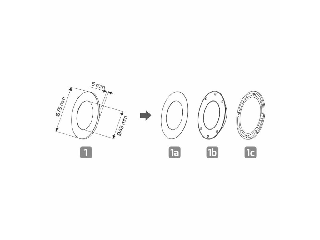 - Rozměry: Ø75 × 6 mm • Výřez pro zápustnou montáž: Ø45 mm