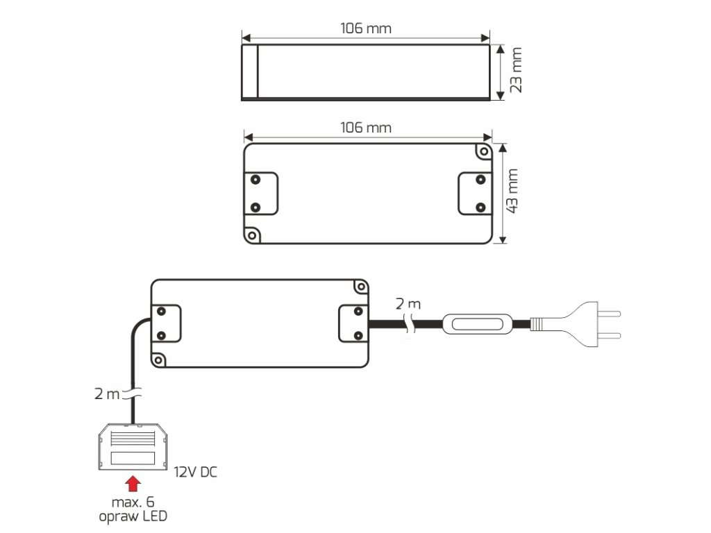 - 1× napájecí zdroj 12 W s vypínačem PC1 (síť 230 V AC → 12 V DC)