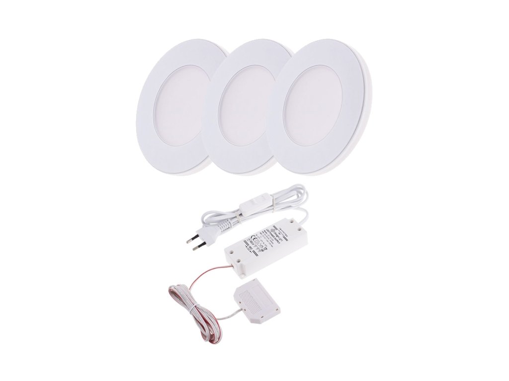 Sada tří svítidel MAGNETO pro podlinkové osvětlení: montáž přisazená i zápustná (výřez Ø45 mm), průměr Ø75 mm, výška 6 mm, 2,8 W / až 260 lm na 1 svítidlo, 3000 - 6000 K, 12 V DC, CRI ≥ 80, IP20, 30 000 h, ≥15 000 cyklů, stmívatelné. V balení zdroj 12 W s posuvným vypínačem PC1 – komplet připravený k zapojení do zásuvky. Každé svítidlo má 2 m kabel s MINI konektorem; kovová krytka drží na magnet.