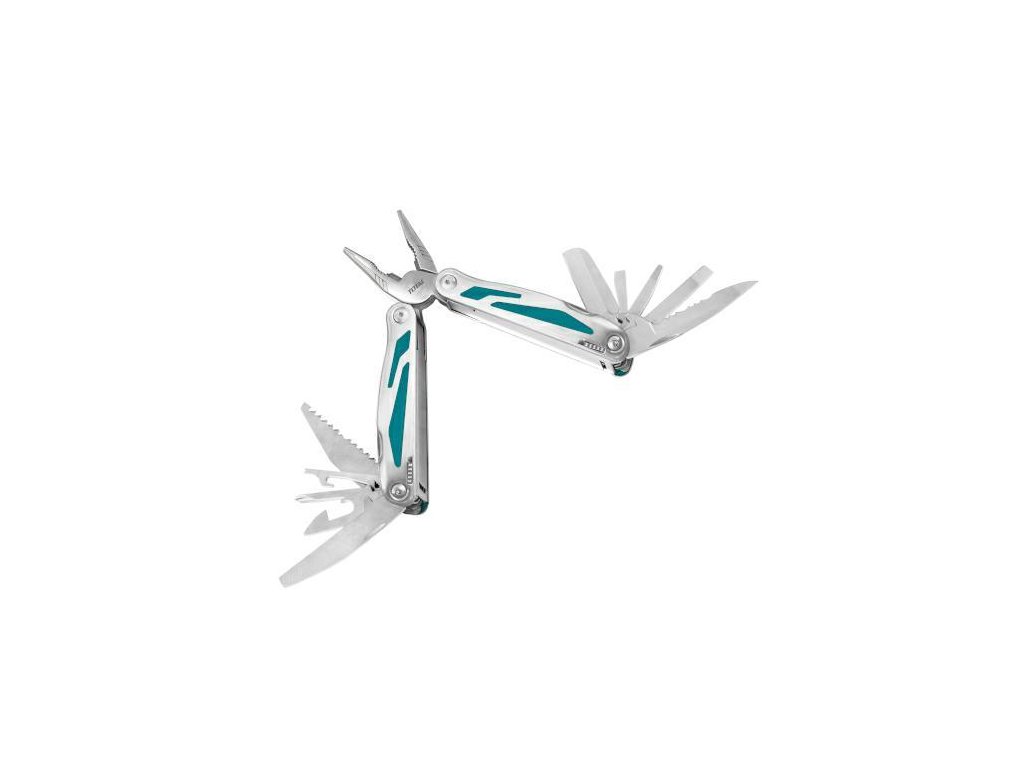 Multitool mod.TFMFT01151 firmy TOTAL Specifikace: - 15 funkcí * Nůž * Zubatý nůž * Otvírač lahví * Otvírač konzerv * Plochý šroubovák SL 3mm * Plochý šroubovák SL 5mm * Plochý šroubovák SL 7mm * Křížový šroubovák * Pilka na dřevo * Pilník na kov/dřevo * Vytlačovač/odstraňovač háčků * Univerzální hák * Kombinační kleště s plochými ozubenými čelistmi, ozubenými čelistmi a řezačem drátu V sadě nylonové pouzdro. - Celková délka po otevření 155mm - Celková délka po zavření: 100mmDoplňkové parametry