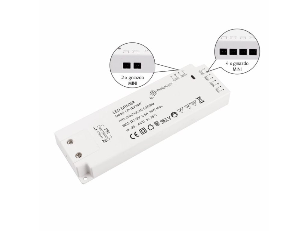 Napájecí zdroj s kabelem – model LD 30W, 12V DC je moderní zdroj pro napájení LED osvětlení. Má 6 vestavěných mini zásuvek, do kterých lze LED světla připojit přímo pomocí mini konektorů.