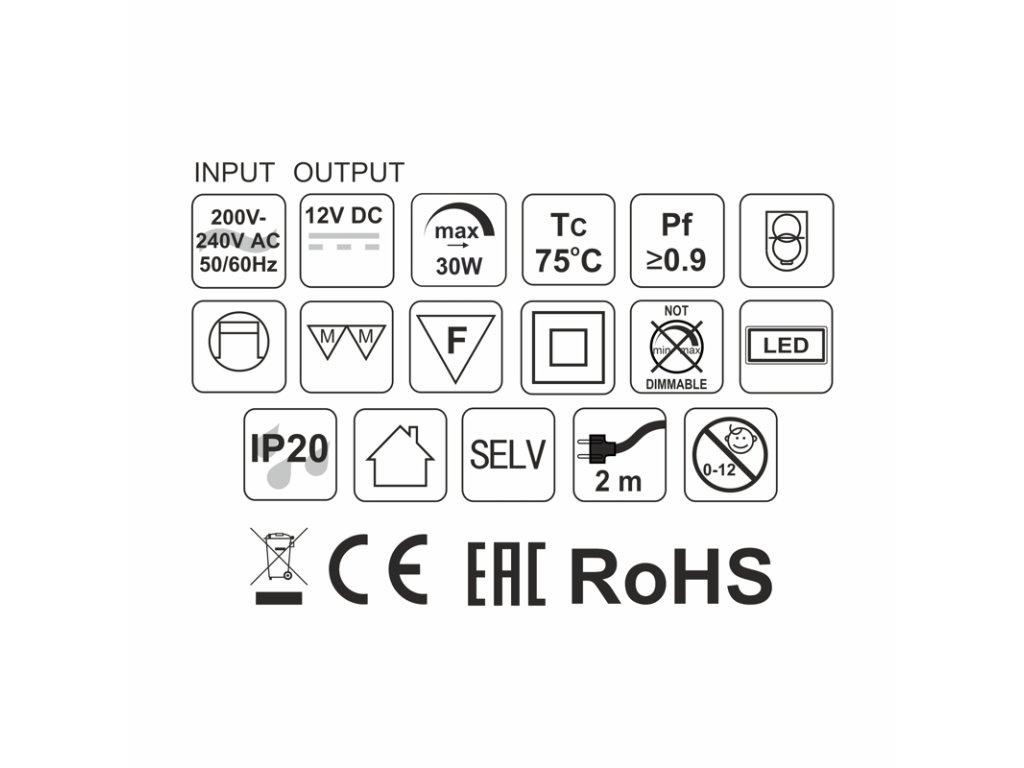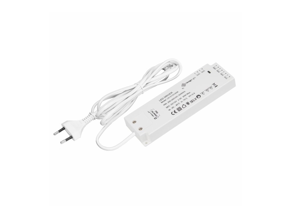 Napájení: 230V~ 50/60Hz. Výstup: 12V DC. Celkový příkon připojeného LED osvětlení: max. 30W.