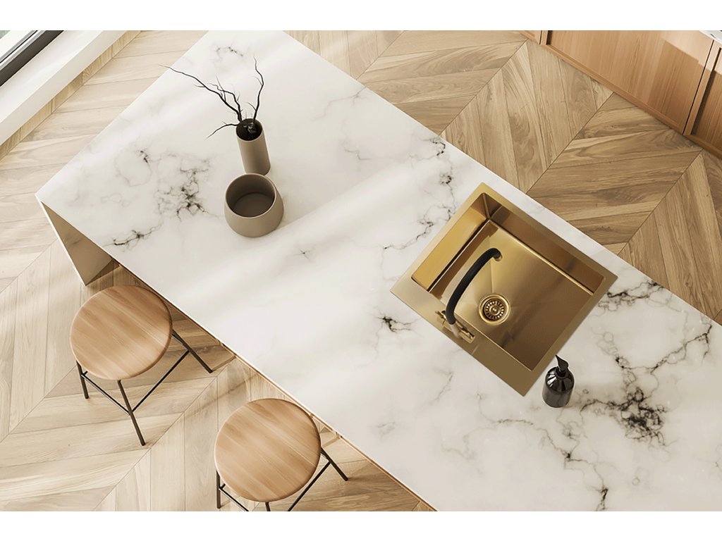 Malawi ve zlatém provedení je jednokomorový nerezový dřez bez odkapávače z nerezové oceli 304 s hladkým povrchem. Má hlubokou komoru 200 mm a je dodáván jako praktický set: součástí je filtrační stojánková baterie Riveco s flexibilním ramínkem a systémem filtrace vody pro pití i vaření. V balení je také Space Saving sifon, který šetří místo ve skříňce a umožňuje připojení myčky.