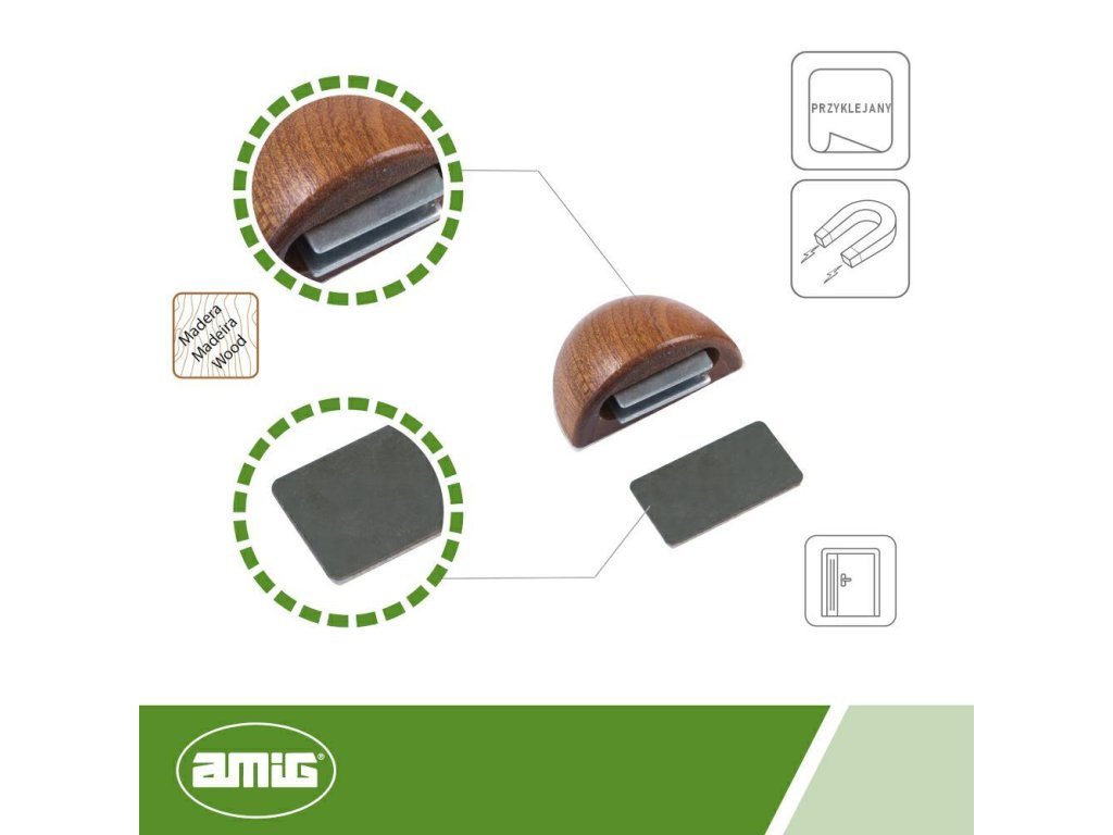 Magnetický doraz, podlahový doraz španělské firmy AMIG, model 407 - Materiál: dřevo + kov + magnet - Povrchová úprava: mahagon - Podlahový doraz - Způsob montáže: samolepicí pomocí pásky 3M Vlastnosti produktu: * Doraz je ideálním a diskrétním řešením zajišťujícím estetický vzhled a plnou funkčnost. * Doraz chrání stěny a dveře před poškozením. * Tento doraz kromě své základní funkce, kterou je ochrana stěny, nábytku či dveří, plní také roli dveřní zarážky díky vestavěnému magnetu * Je snadný a rychlý na montáž, nevyžaduje vrtání otvorů v podlaze Technický výkresDoplňkové parametry