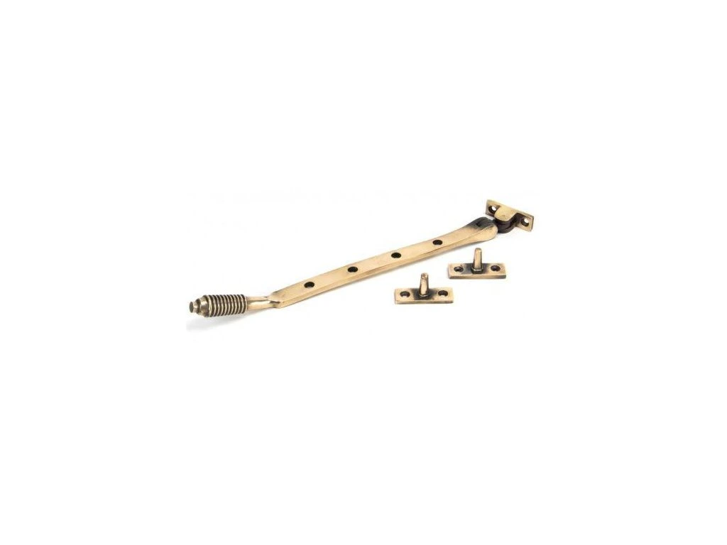 Rozwórka okienna, ogranicznik otwarcia, blokada otwarcia okna - Materiał: brąz - Wykończenie: brąz polerowany - Długość całkowita: 296mm - Długość ramienia: 275mm - Wymiary podstawy zaczepu: 47x16mm - Dostarczany z pasującymi wkrętami do drewna Ten ograniczniki jest wykuty z litego brązu, co podkreśla wysoką jakość materiałów i zastosowanych technik wykonania.