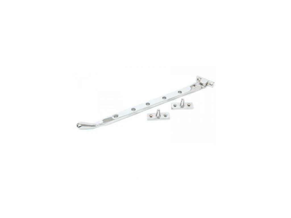 Rozwórka okienna, ogranicznik otwarcia, blokada otwarcia okna model PEAR DROP - Wykończenie: chrom połysk - Długość całkowita: 335mm - Długość ramienia: 312mm - Wymiary podstawy zaczepu: 47x16mm - Dostarczany z pasującymi wkrętami do drewna