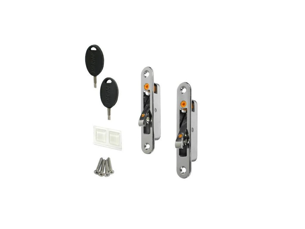Ogranicznik otwarcia z blokadą, dedykowany do okien podnoszonych (przesuwnych w pionie) - Wykończenie: chrom połysk - Wymiary zewnętrzne (wys x szer): 90x16mm - Wymiary kasety (wys x szer x gł): 61x12x15mm W zestawie: * ogranicznik - 2 szt. * kluczyki - 2 szt. * wkręty do montażu 4x25mm - 4szt. * odboje silikonowe - 2szt. Wersja Face Fix montowana jest w ramiakach skrzydła górnego po jednej z każdej strony. Elementy działają pojedynczo, więc zamontowanie dwóch zapewnia zgodność z ASTM F2090-21. Do okien drewnianych i PCV