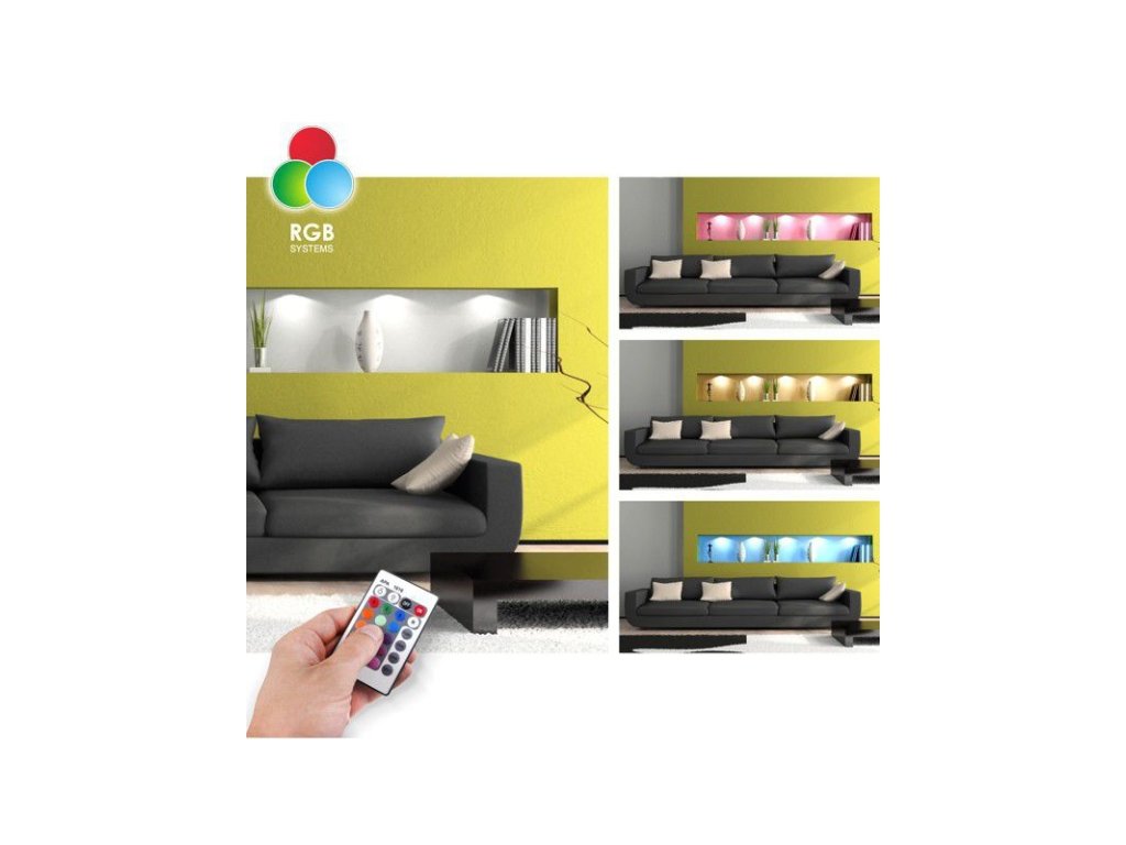 Povrchová montáž pod skříňky nebo do vitrín; přichycení vruty nebo oboustrannou páskou. Přes kontrolér nastavíš barvu/programy RGB, IR ovladač je součástí setu.