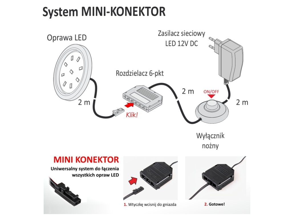 Kompaktní oprawa pro podlinkové a nábytkové osvětlení. Díky 2 m kabelu s MINI konektorem připojíte svítidlo bez pájení; teplá, neutrální, studená 3000 - 6000 K dodá materiálům příjemný, klidný tón.