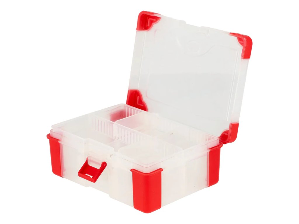 Organizer wykonany z wytrzymałego tworzywa sztucznego. Posiada 6 odzielnych przegródek oraz wyjmowaną tackę, przeznaczoną do przechowywania i segregacji drobnych przedmiotów i akcesoriów. Wyposażony jest w zamknięcie, gumowe narożniki chroniące pojemnik przed upadkiem i zniszczeniem. Pojemnik jest transparentny, umożliwiając sprawdzenie jego zawartości bez otwierania.
