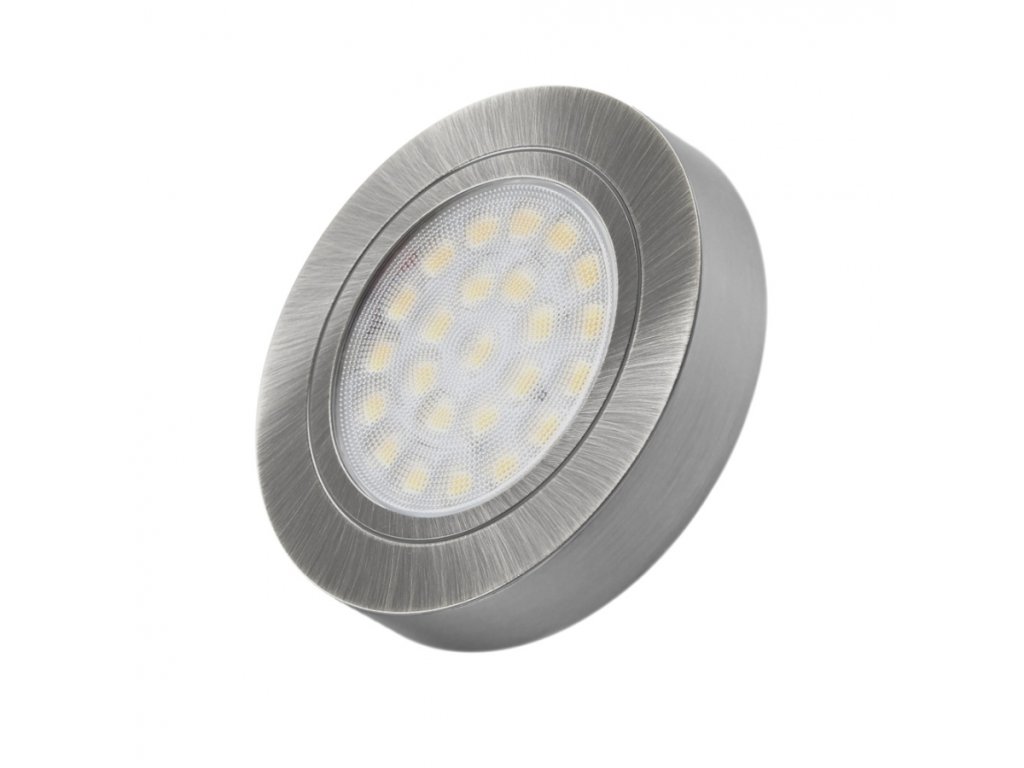 Podskříňové LED svítidlo OVAL s distančním kroužkem. 24 LED / 2 W, 200 lm, 12 V DC, průměr Ø 65 mm, IP20. 2 m kabel s MINI-KONEKTOREM. Barva světla 3000 - 6000 K; tělo inox. Montáž na vruty