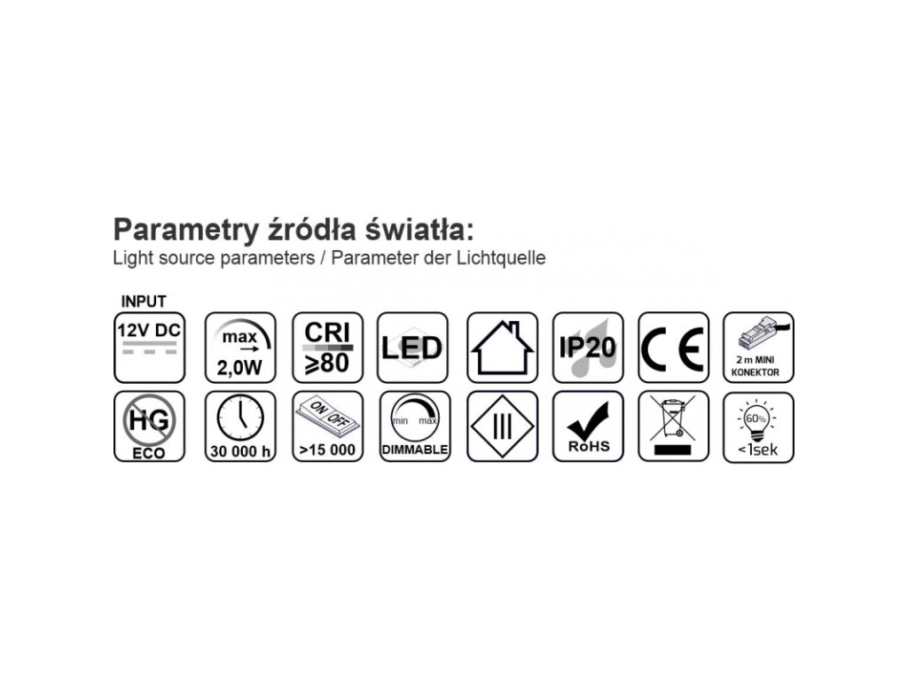 - Napětí: 12 V DC • Příkon: 2 W • Světelný tok: 200 lm