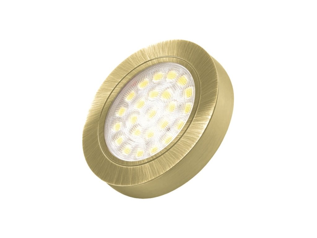 Podskříňové LED svítidlo OVAL s distančním kroužkem. 24 LED / 2 W, 200 lm, 12 V DC, průměr Ø 65 mm, IP20. 2 m kabel s MINI-KONEKTOREM. Barva světla 3000 - 6000 K; tělo zlatá. Montáž na vruty