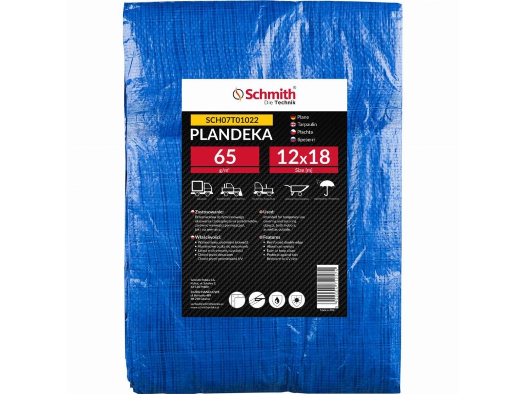 Plachta Schmith je praktické řešení pro dočasné zakrytí a ochranu předmětů v interiéru i exteriéru. Plachta je vyrobena z lehkého materiálu o hmotnosti 65 g/m² a je vybavena hliníkovými průchodkami rozmístěnými po obvodu pro snadné a stabilní upevnění. Zesílené dvojité okraje zajišťují dodatečnou trvanlivost a odolnost proti mechanickému poškození. Díky rozměrům 12 × 18 m je ideální pro zabezpečení větších ploch, jako je nábytek, nářadí nebo palivové dřevo.