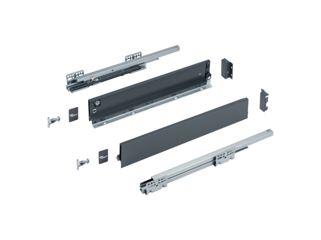 Pojezd na šuplíky ELITE BOX – nízké provedení H84 mm, barva antracit, délky 250–550 mm. Úzké boky, plný výsuv, tichý dotah, synchro.