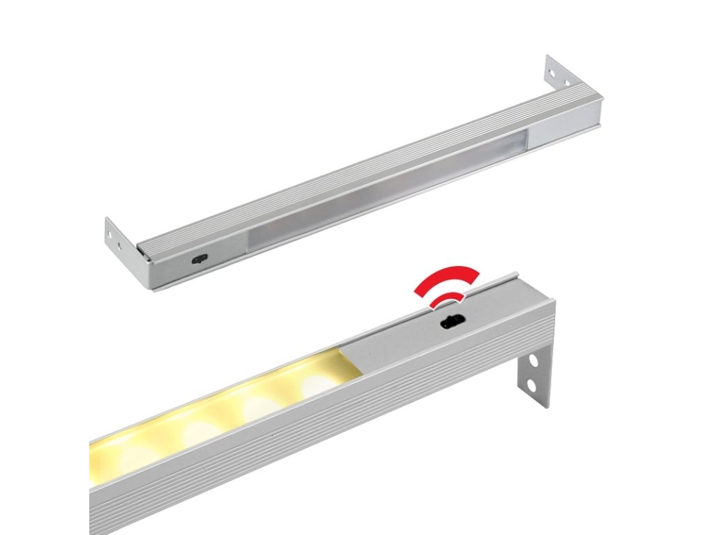 Hliníková lišta POLARUS P pro osvětlení zásuvek s integrovaným senzorem přiblížení: při otevření zásuvky se rozsvítí, po zavření zhasne. Délka 864 mm, 3000–6000 K, příkon 8,8 W, napájení 12 V DC, IP20. V balení 2 m kabel s mini konektorem; LED čipy 2835. Barva těla hliník.