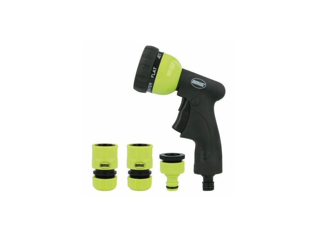 Zestaw do nawadniania wykonany z ABS W zestawie: - 1x pistolet do podlewania z 7 funkcjami. - 1x adapter+redukcja 1/2"-3/4". - 1x szybkozłączki do węża 1/2" z funkcją STOP - 1x szybkozłączki do węża 3/4"