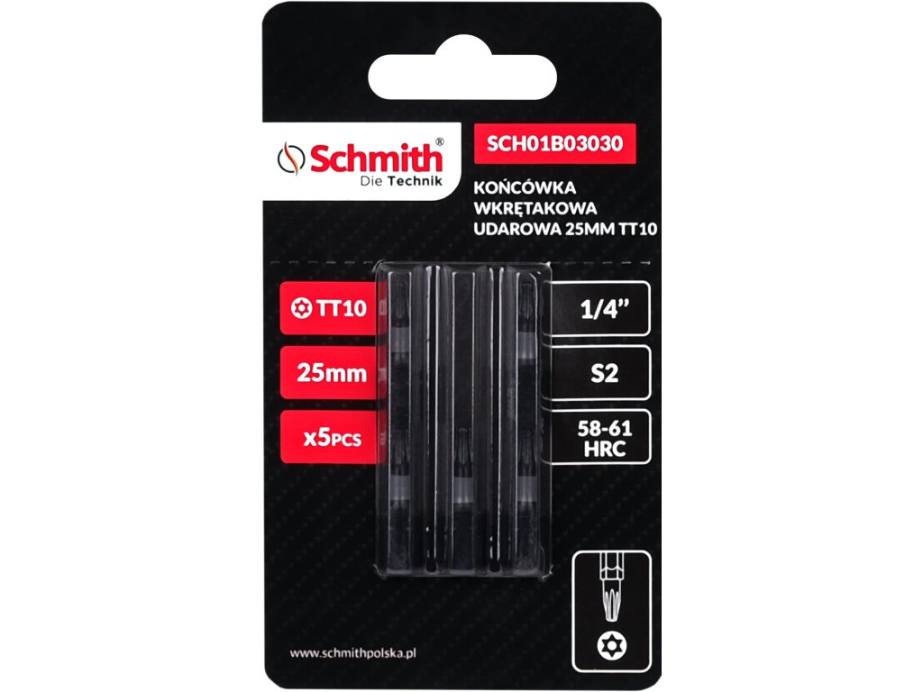 Délka 25 mm umožňuje pohodlnou manipulaci se šroubovákem a usnadňuje přístup do těžko přístupných míst. Standardní velikost sklíčidla 1/4 palce je univerzální a kompatibilní s většinou šroubováků a rázových utahováků na trhu. Bity jsou vyrobeny z vysoce kvalitní oceli S2, která se vyznačuje vysokou tvrdostí a pevností, takže je ideální pro ruční i elektrické nářadí. Tvrdost 58-61 HRC, stanovená na Rockwellově stupnici, zaručuje velmi vysokou odolnost proti opotřebení, což zajišťuje dlouhou životnost nástroje i při intenzivním používání.