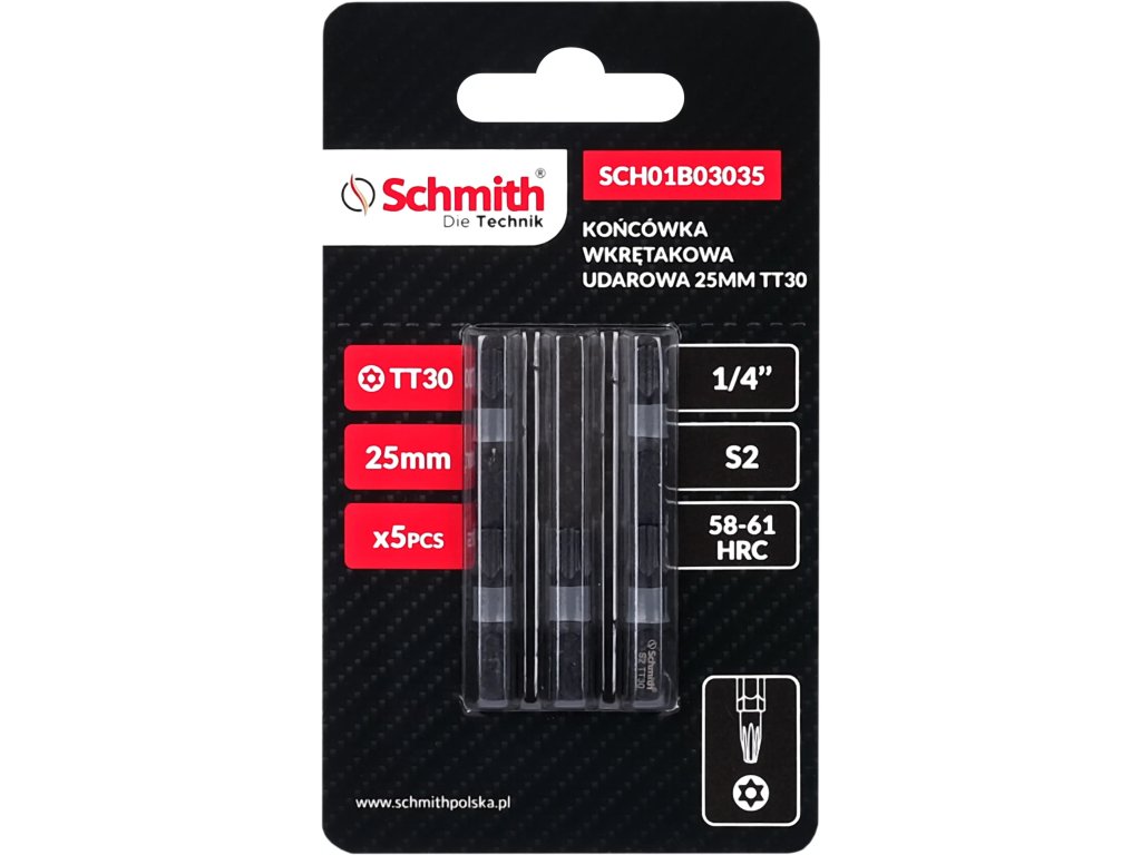 Délka 25 mm umožňuje pohodlnou manipulaci se šroubovákem a usnadňuje přístup do těžko přístupných míst. Standardní velikost sklíčidla 1/4 palce je univerzální a kompatibilní s většinou šroubováků a rázových utahováků na trhu. Bity jsou vyrobeny z vysoce kvalitní oceli S2, která se vyznačuje vysokou tvrdostí a pevností, takže je ideální pro ruční i elektrické nářadí. Tvrdost 58-61 HRC, stanovená na Rockwellově stupnici, zaručuje velmi vysokou odolnost proti opotřebení, což zajišťuje dlouhou životnost nástroje i při intenzivním používání.