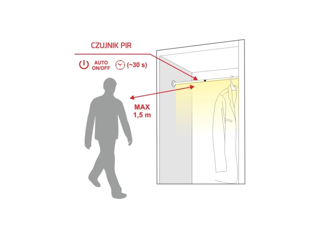 RELING PLUS PIR je kulatá LED šatní tyč do skříně nebo otevřené šatny s pohybovým PIR čidlem. V dosahu cca 1,5 m zapne světlo a zhruba po 30 s od opuštění detekční zóny ho vypne.