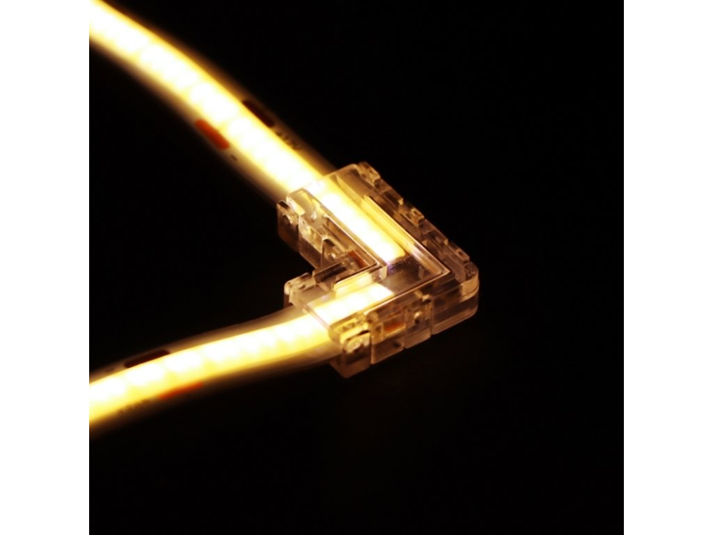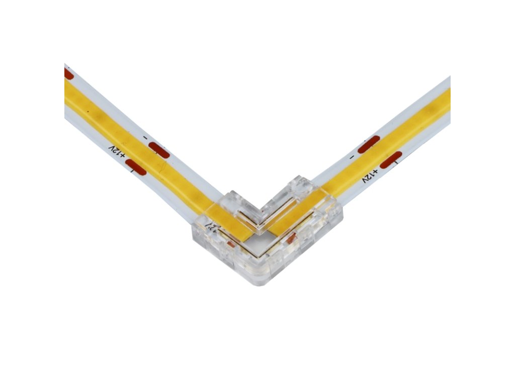 Rohová spojka pro propojení LED pásku COB o šířce 8 mm umožňuje rychle spojit dvě pásky (nebo úseky pásků) bez nutnosti pájení.