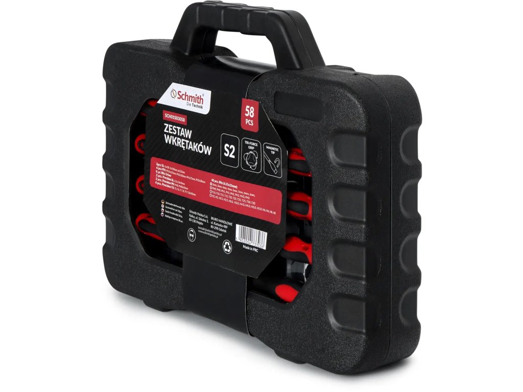 Sada šroubováků Schmith 58 dílů je univerzální sada nářadí, která je vhodná pro přesné i všeobecné práce. Nářadí je vyrobeno z odolné oceli S2, která zajišťuje dlouhou životnost. Magnetické hroty usnadňují práci s kovovými díly, ergonomická rukojeť a saténový povrch zajišťují pohodlí.