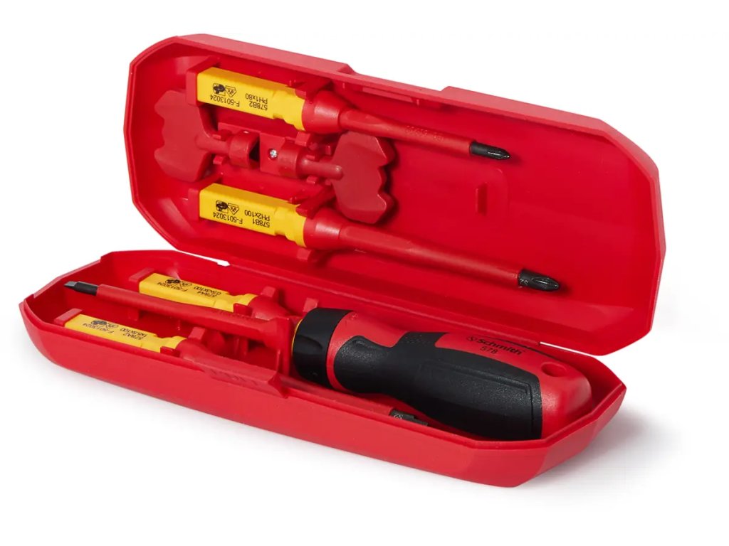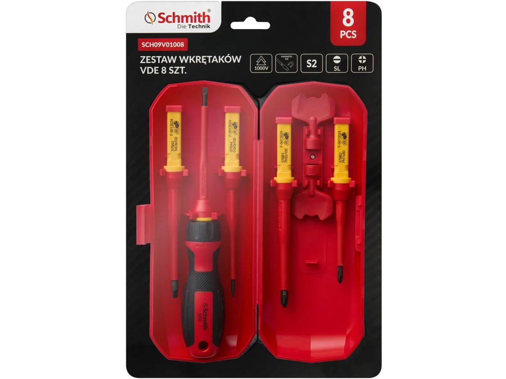 Sada šroubováků Schmith VDE 8 ks je vysoce kvalitní nářadí určené pro práci s elektroinstalacemi. Díky izolaci VDE je nářadí vhodné pro bezpečné použití při napětí až 1000 V. Sada obsahuje různé typy plochých a křížových šroubováků, které pokrývají širokou škálu použití při práci s elektrickým zařízením. Všechny bity jsou vyrobeny z odolné oceli S2, což zajišťuje dlouhou životnost a přesné uchycení šroubů. Hroty jsou opatřeny černou povrchovou úpravou pro zvýšení odolnosti proti opotřebení.