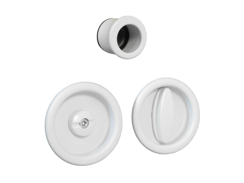 Komplet zapuštěných madel SCIVOLA-Q pro posuvné dveře, do WC - Materiál: ocel - Povrchová úprava: bílé matové - Průměr krytky z knoflíkem: 60mm - Určený pro dveře o tloušťce: 40-48mm - Sada obsahuje knoflík blokace WC a prstové madlo - Čtyřhran: 8mmDoplňkové parametry