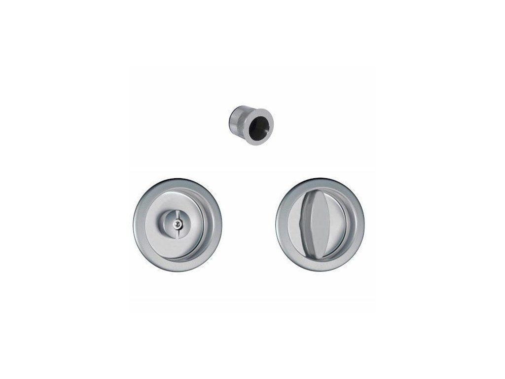 Komplet zapuštěných madel SCIVOLA-Q pro posuvné dveře, do WC Materiál: ocel Povrchová úprava: chrom satén Průměr krytky z knoflíkem: 60mm Určený pro dveře o tloušťce: 40-48mm Sada obsahuje knoflík blokace WC a prstové madlo Čtyřhran: 8mmDoplňkové parametry
