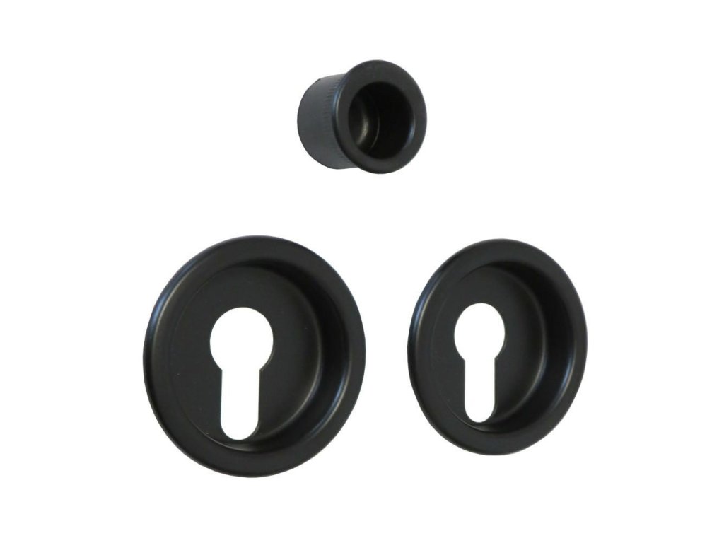 Komplet zapuštěných madel pro posuvné dveře model SCIVOLA-TRE - Verze: na vložku - Materiál: ocel - Barva: černý - Vnější průměr krytky: 60mm - Sada obsahuje 2 zapuštěná madla na vložku a prstové madlo (náprstek)Doplňkové parametry