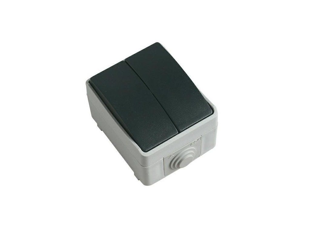 Łącznik dwugrupowy - Materiał wykonania: poliwęglan - Kolor wykończenia: szary - Maks. natężenie prądu: 10A - Maks. napięcie: 230V - Maks. moc: 2300W - Klasa wodoszczelności: IP54